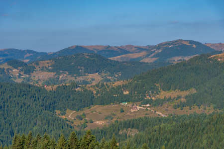 Panoramic view over the Carpatian mountains, green valleys and beautiful blue sky at the background.