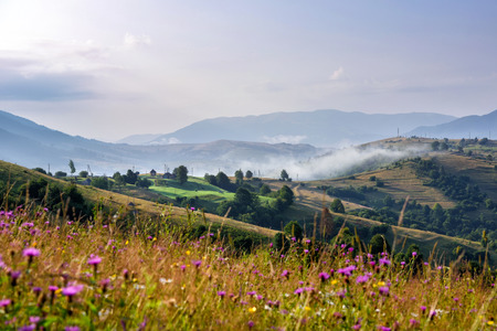 Rural landscape with fog in Sirnea – Fundata village, Transylvania landmark, Romania
