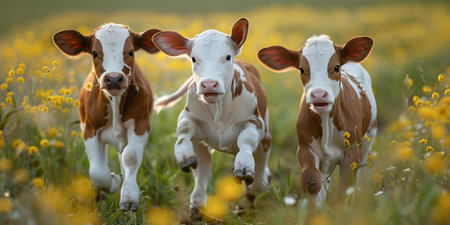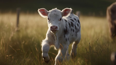 Playful Meadow Calves Frolicking Playfulness and Energy Captured. Concept Cattle, Meadow, Cute Animals, Playful Behavior, Energy