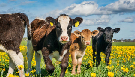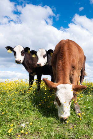 calves in spring meadow full of yellow buttercups under blue sky with clouds