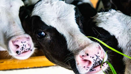 close up view of little domestic calves standing in barn at farm
