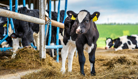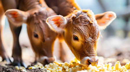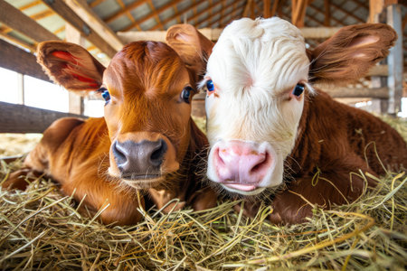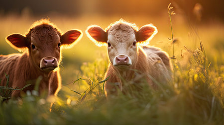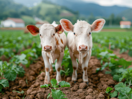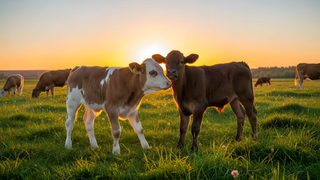 Witness sustainable livestock farming with these cute calves! This image demonstrates climate-smart agriculture, showcasing responsible methods to reduce environmental impact and ensure a healthier planet See how modern solutions contribute to a climate-friendly future, highlighting the vital role of livestock in sustainable agriculture AI Generative