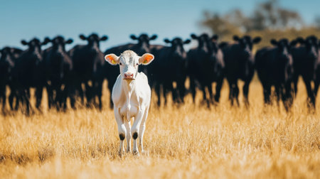 A young white calf stands alone in a golden field, surrounded by a herd of black cattle. The sunny rural landscape creates a serene and peaceful atmosphere.