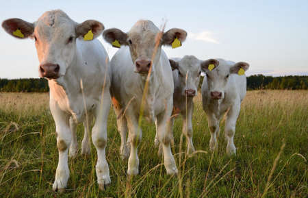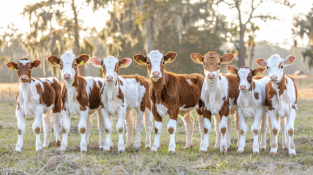 Herd of young calves in a field at sunset, the soft light outlining their curious faces.