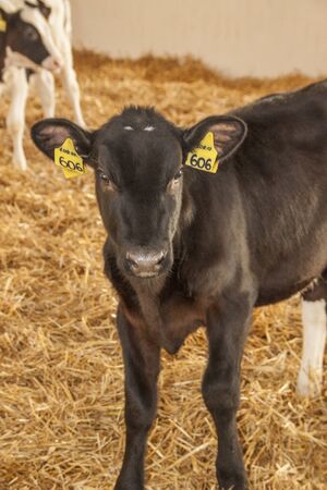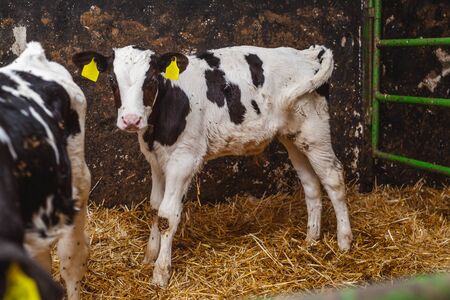 Young black and white calf at dairy farm. Newborn baby cow.