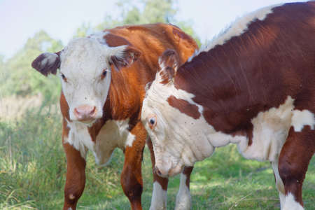 Two brown and white cows in the pasture, closeup