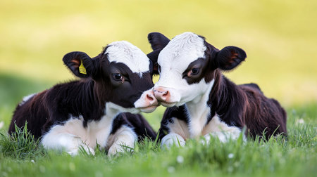 Two adorable calves rest side by side on green grass, showcasing their innocence and friendship in a serene farm setting. Perfect for nature and animal lovers.