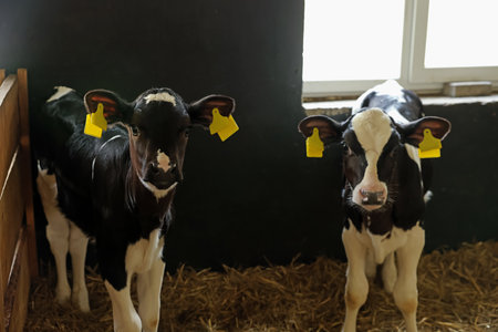 Cute young black calves in cowshed on dairy farm. Agriculture industry, farming and animal husbandry