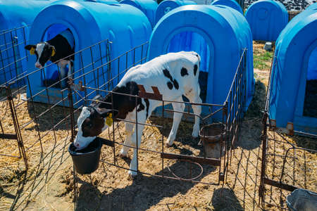 Young calves in blue calf-houses at diary farm.