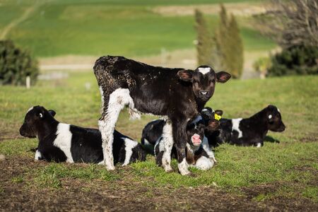 Calves on a green pasture in New Zealand