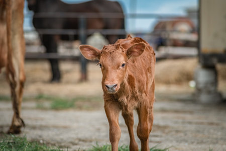 Baby cow calf standing at stall at farm countryside.