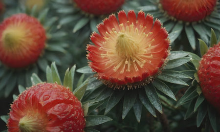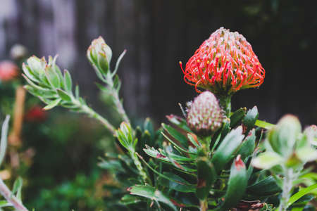 native Australian protea with red flowers outdoor with raindrops in beautiful tropical backyard shot at shallow depth of field