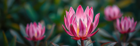 close-up of pink protea plant outdoor in sunny backyard shot at shallow depth of field