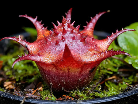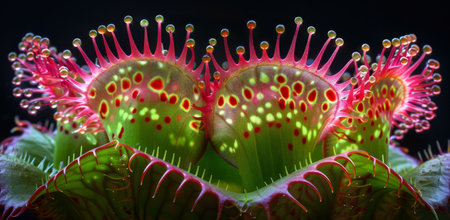 A macro shot of a carnivorous plant leaf with dew drops on its surface.