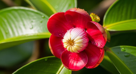 A closeup macro shot of an exotic red plant covered in sparkling dewdrops, surrounded by natural greenery, creating a vibrant and fresh scene.