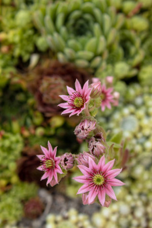 Succulent pink flower in focus with a background of green succulents. Natural background or wallpaper