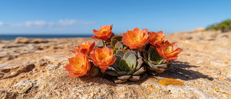 Orange succulent flowers blooming on a rocky cliff overlooking the ocean