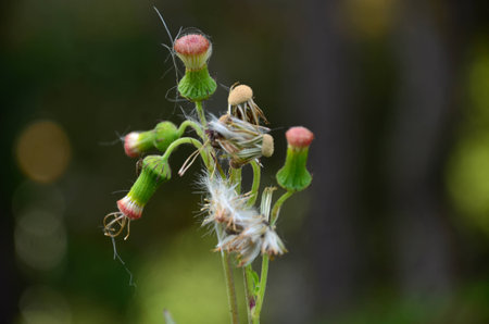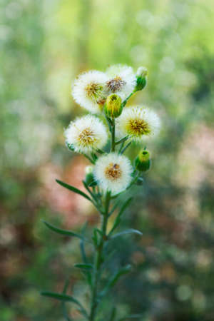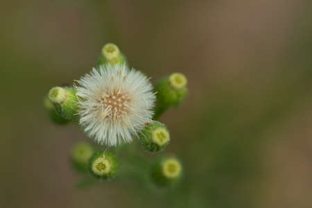White seeds of Little ironweed on branch and blur green background, Thailand. Another name is Ash-coloured fleabane, Ash-coloured ironweed, Purple fleabane, Purple-flowered fleabane.