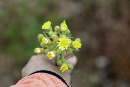 Detail of a woman's hand with a handful of yellow wild flowers
