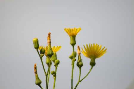 Close-up of perennial sowthistle flowers and buds on blue sky