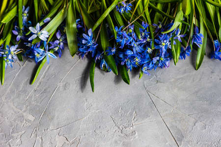 Spring card concept with bright blue flowers of scilla siberica on rustic background with copy space