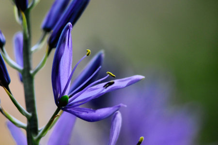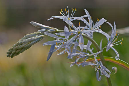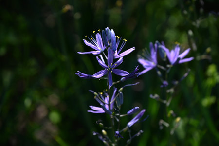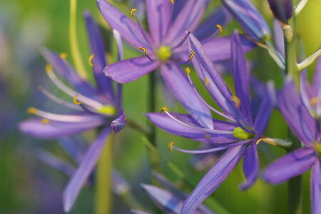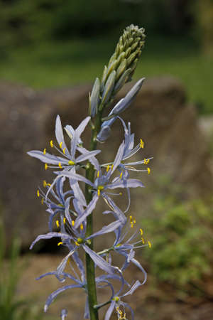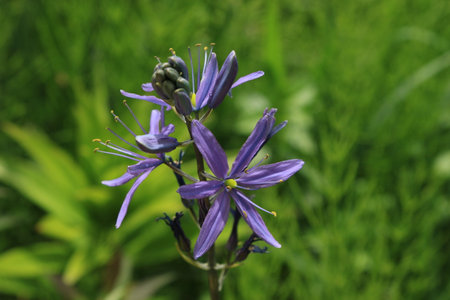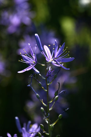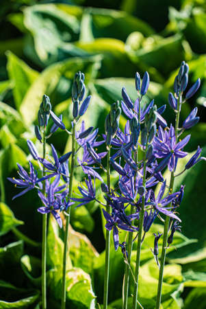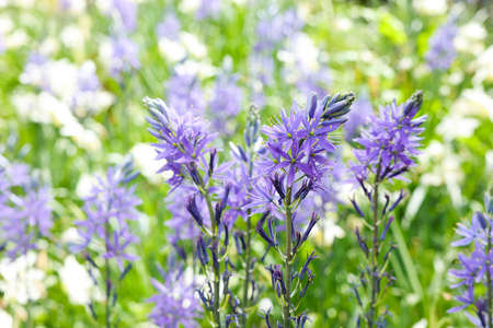 Camassia flowers. Asparagaceae bulbous plants. Star-shaped, six-petaled, blue-purple flowers bloom from April to May.