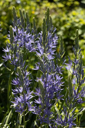 Beautiful Camassia blue flowers in the garden, selective focus.