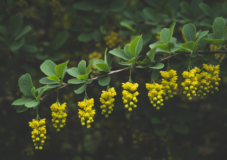 European Barberry (Berberis vulgaris) in garden.Yellow flowers and buds cluster on blooming Common or European Barberry, Berberis Vulgaris.