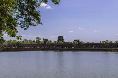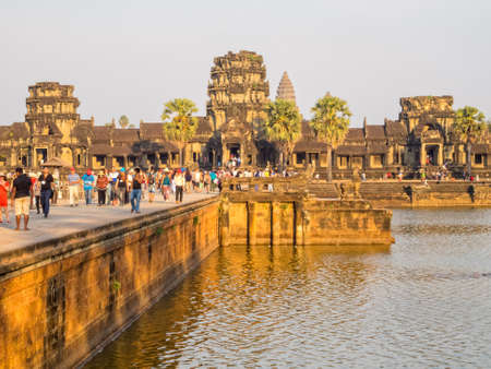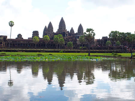 Siem Reap, Cambodia- DEC 6, 2013: Angkor Wat temple, the world largest Hindu temple reflect on water in sunny day.