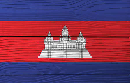 Flag of Cambodia on wooden wall background. Grunge Cambodia flag texture, blue red and white color with black line of Angkor wat.