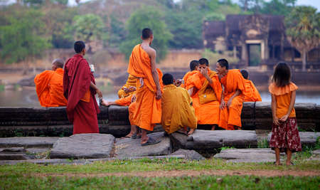 Buddhist monks in Angkor wat temple complex in Cambodia, Siem Reap Buddhist temple in Asia