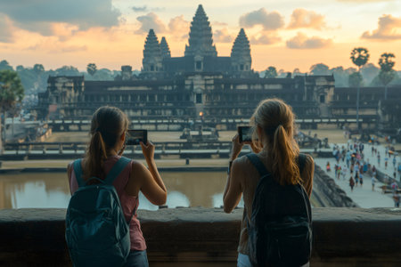 Two young women with backpacks taking pictures of Angkor Wat during sunrise in Siem Reap, Cambodia