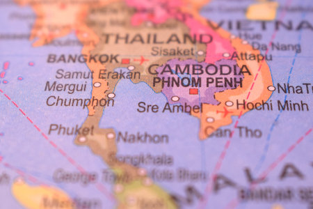 Close up to a Phnom Penh city with a blue pin needle into Cambodia country political map