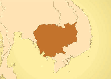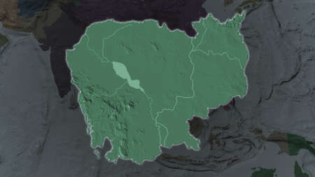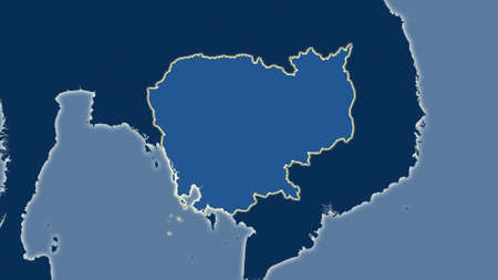 Cambodia area enlarged and glowed on a darkened background of its surroundings. Colored and bumped map of the administrative division