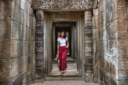 Beautiful, pretty, young Thai girl is exploring the ancient ruins of Angkor Wat (City/Capital of Temples) Hindu temple complex in Siem Reap, Cambodia. The largest religious monument in the world