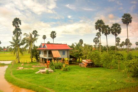 Southeast Asian landscape in rainy season 5, house with red roof, Cambodia