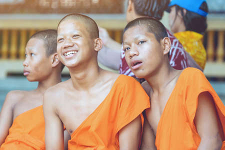 KANCHANABURI-THAILAND, APRIL 17,2019: Unidentified novices sit and wait for the water pouring ceremony on the Songkran festival at temple on april 17, 2019 in Kanchanaburi, Thailand