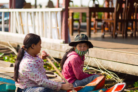 Puok, Siem Reap Province, Cambodia - 4 April 2013: Local Cambodian mother with kid rowing along Tonle Sap lake at floating village