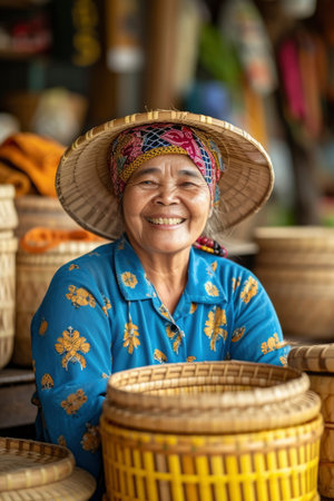 A resident woman from Thailand stands confidently with a slight smile, dressed in a colorful floral dress. The backdrop features market stalls and greenery, creating an inviting atmosphere.