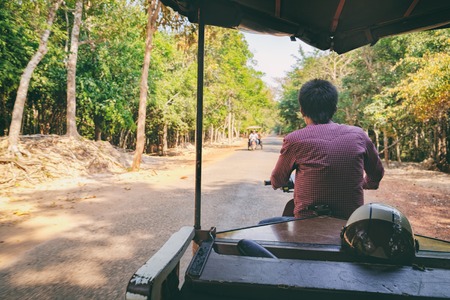 Siem Reap, Cambodia - February 4, 2016: Point of view shot from inside a moving tuk tuk. Tropical forest around the sandy and dusty road on the way to the ancient ruins of Angkor Wat