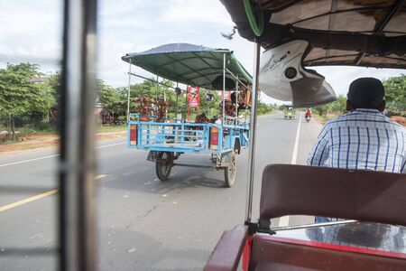 a tuk tuk at the mainroad in the city centre of Kampong Thom of Cambodia. Cambodia, Kampong Thom, November, 2017,