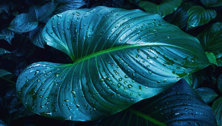 Moody atmospheric close-up of large tropical foliage with pristine water beads creating natural texture patterns. Perfect for wellness, spa, nature conservation campaigns.