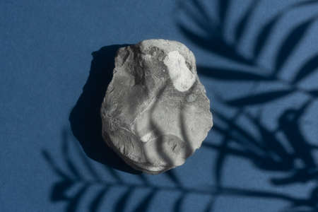 A stone gray podium on a blue background with a shadow from the leaves of a palm tree. Showcase for product promotion, beauty, natural eco cosmetic.