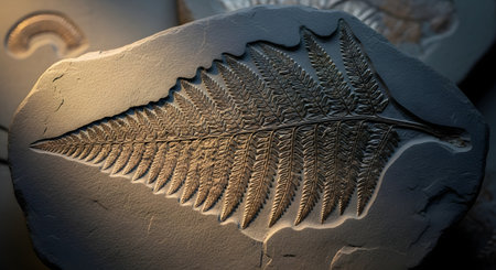 A beautifully preserved fossil of a fern frond imprinted in a dark sedimentary rock. Warm lighting from the side accentuates the intricate details of the leaf's veins and structure, capturing a piece of prehistoric botanical history.