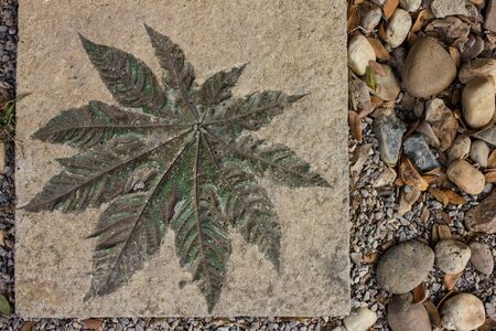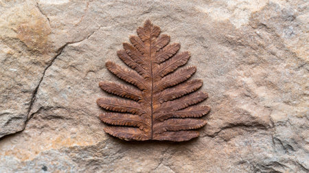 Fossilized fern leaf on rocky surface