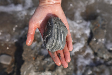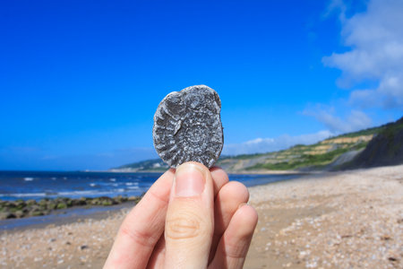 A hand holding a fossil - fossil hunting in Dorset on the Jurassic coast