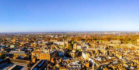 Aerial view of the old town of Cambridge. Beautiful Kings College Chapel