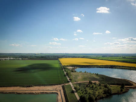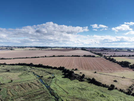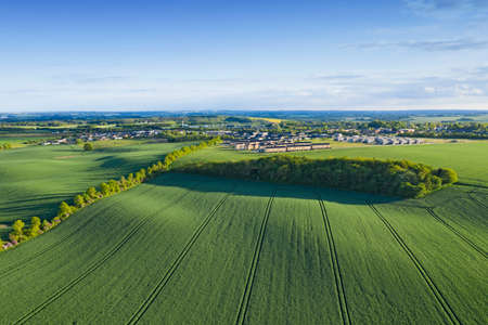 Drone point of view of farm or countryside estate, green pasture fields and blue sky copy space. Scenic aerial landscape of farming agriculture, trees and residential building houses in remote meadow