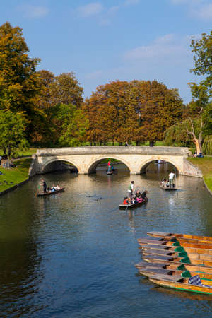 CAMBRIDGE, UK - OCTOBER 11, 2014: Punting on the River Cam in Cambridge, England. A punt is a flat-bottomed boat with a square-cut bow, designed for use in small rivers and shallow water. The punter propels the punt by pushing against the river bed with a