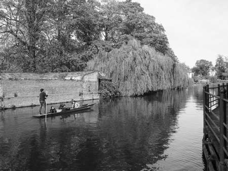 CAMBRIDGE, UK - CIRCA OCTOBER 2018: Punting on River Cam in black and white
